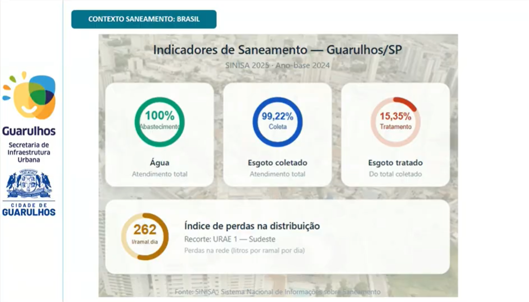 Também foi realizada apresentação técnica pela Companhia de Saneamento Básico do Estado de São Paulo (Sabesp), em conjunto com a Secretaria de Infraestrutura Urbana (SIURB), abordando as obras em execução no território do Município. Foram destacadas intervenções voltadas à ampliação e melhoria dos sistemas de coleta e tratamento de esgoto, com impactos diretos na qualidade ambiental e na infraestrutura urbana.
